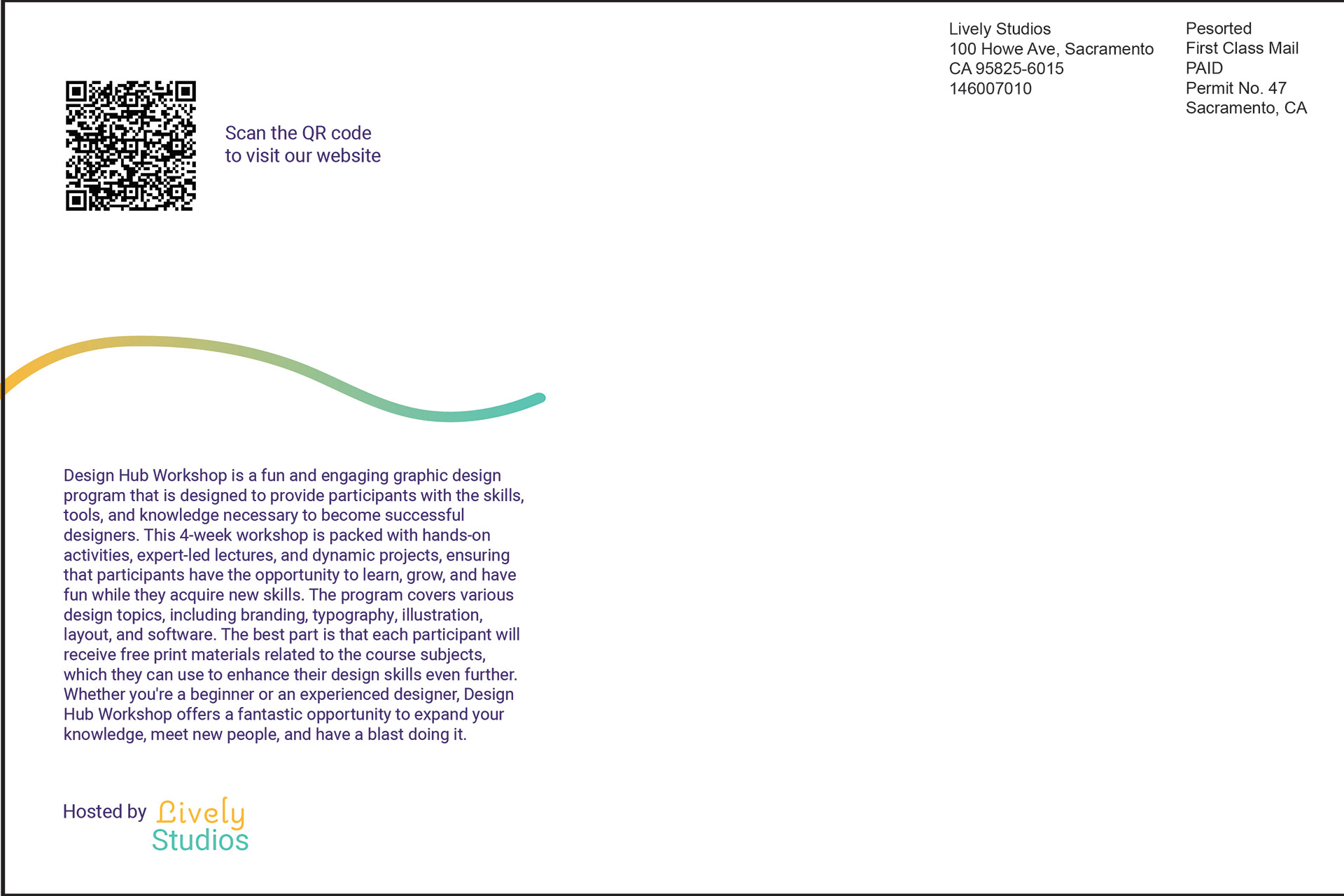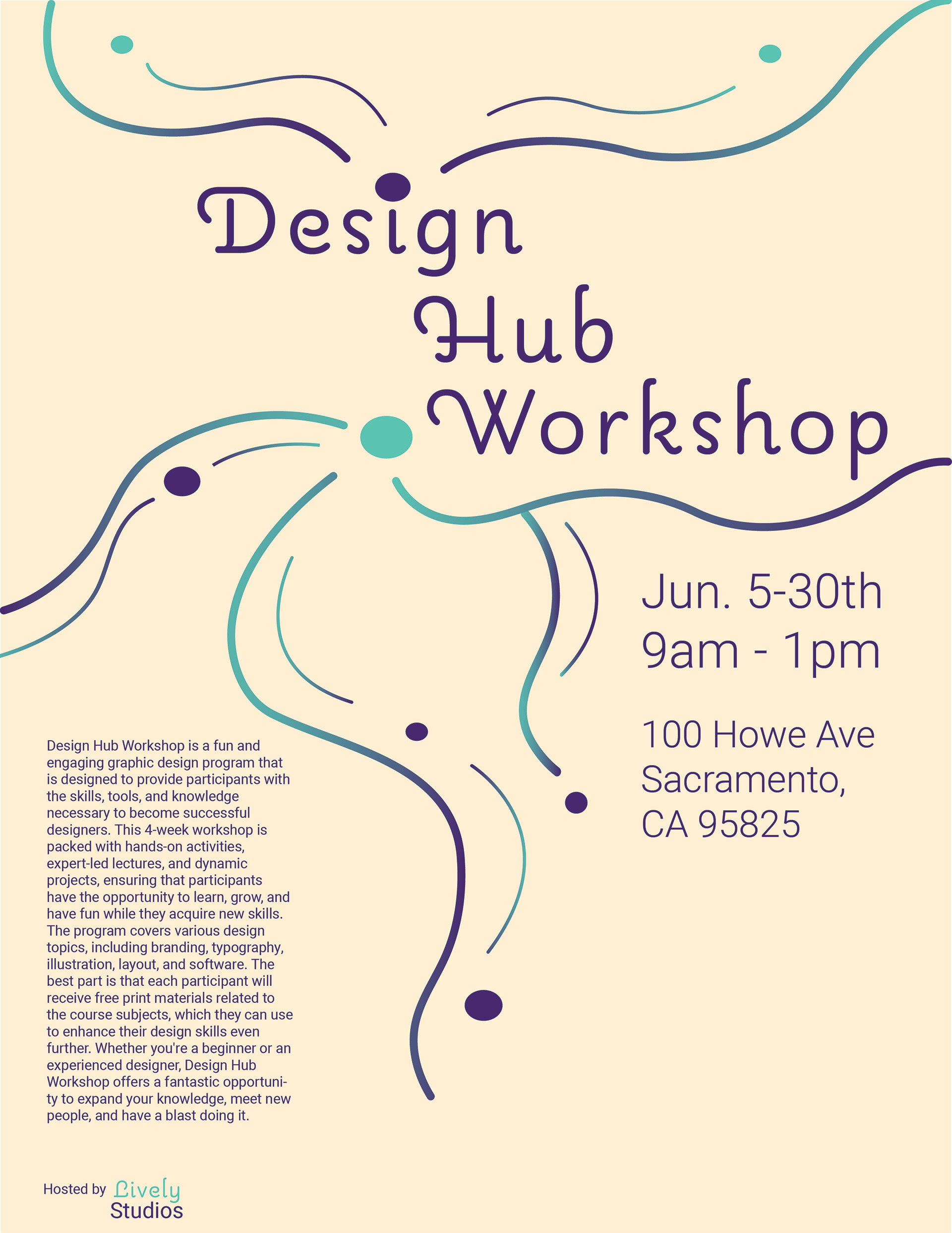 This project features a touchpoint system for a graphic design workshop called the Design Hub Workshop by Lively Studios. It showcases a fun and colorful visual system that is emphasized through contrasting cool as well as warm colors and wavy visual elements. This design solution was created to tackle issues in regards to gaps in information and lack of resources that are prevalent to the graphic design field.